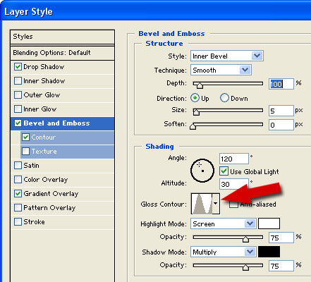 This tutorial uses Gloss Contour, a feature only present in Adobe Photoshop 6.0 and later versions.